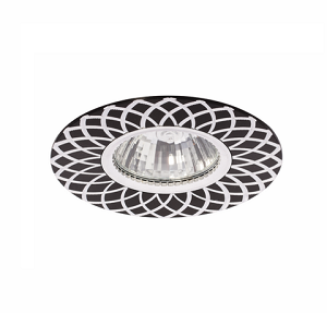 Корпус литой, из алюминия, черного цвета, блестящий, гладкий, с декорированием по поверхности.С цоколем GU5,3. Внешний диаметр 90 мм, монтажное отверстие 60 мм.