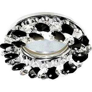 Основание изготовлено из нержавеющей стали, стального цвета, блестящее, с золотым ободом по краю. Плафон округлой формы, ограненный, декорирован под хрустальный, с прозрачными и черными элементами украшения. Диаметр 96 мм, диаметр отверстия 60 мм, с цоколем GU5.3.