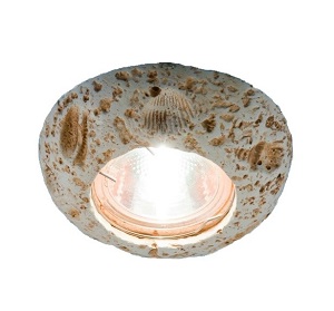 Основание изготовлено из металла. Плафон округлой формы, рельефный, декорирован под античный камень, непрозрачный, серо-бежевого цвета. Диаметр 95 мм, диаметр отверстия 70 мм, с цоколем GU5.3.