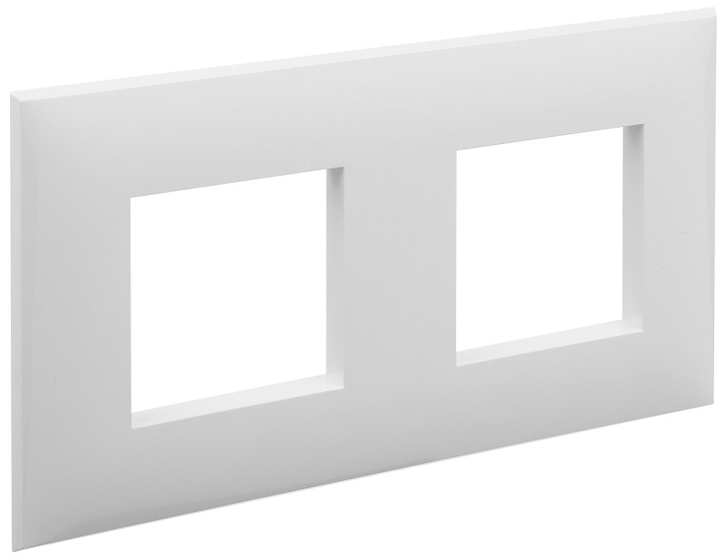 Рамка имеет 2 места под электроустановочные изделия (максимальная вместимость – 4 модуля), может размещаться как горизонтально, так и вертикально. Габаритные размеры: 160х90 мм. Материал – термопласт.
