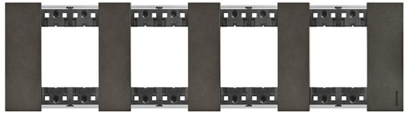 Декоративная рамка серии Living Now от компании Bticino итальянского стандарта цвета космос, изготовлена из цинк-алюминиевых сплава с медью - ZAMAK. Отделка декоративных рамок из zamak частично выполнена вручную. По этой причине наличие индивидуальных отличий между рамками является их уникальной особенностью. Занимает 4 поста и 2+2+2+2 модуля, поэтому используется в комбинации с четырьмя суппортами K4702. Идеально сочетается с лицевыми панелями и клавишами механизмов чёрного цвета. Страна производства всех изделий Bticino серии Living Now и их комплектующих Италия.