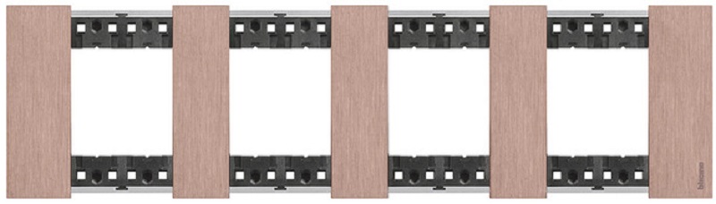 Декоративная рамка серии Living Now от компании Bticino итальянского стандарта цвета медь, изготовлена из цинк-алюминиевых сплава с медью - ZAMAK. Отделка декоративных рамок из zamak частично выполнена вручную. По этой причине наличие индивидуальных отличий между рамками является их уникальной особенностью. Занимает 4 поста и 2+2+2+2 модуля, поэтому используется в комбинации с четырьмя суппортами K4702. Идеально сочетается с лицевыми панелями и клавишами механизмов песочного цвета. Страна производства всех изделий Bticino серии Living Now и их комплектующих Италия.