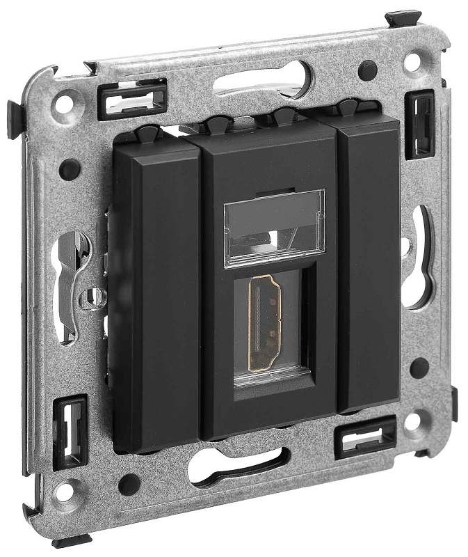 HDMI-розетка. Назначение: для монтажа в подрозеточные коробки глубиной не менее 45 мм (код 59301). Используется в качестве мультимедийной розетки для передачи сигнала (подключение проекторов, мониторов, телевизоров и др.). Характеристики: 1 модуль, с пылезащитной шторкой; с маркировочной табличкой; в комплекте разъем Keystone; для заделки контактов используется инструмент типа 110; тип розетки – "А-А" или "мама-мама"; фиксация в подрозеточные коробки глубиной не менее 45 мм при помощи каркаса с лапками (код 4400802) и саморезов.