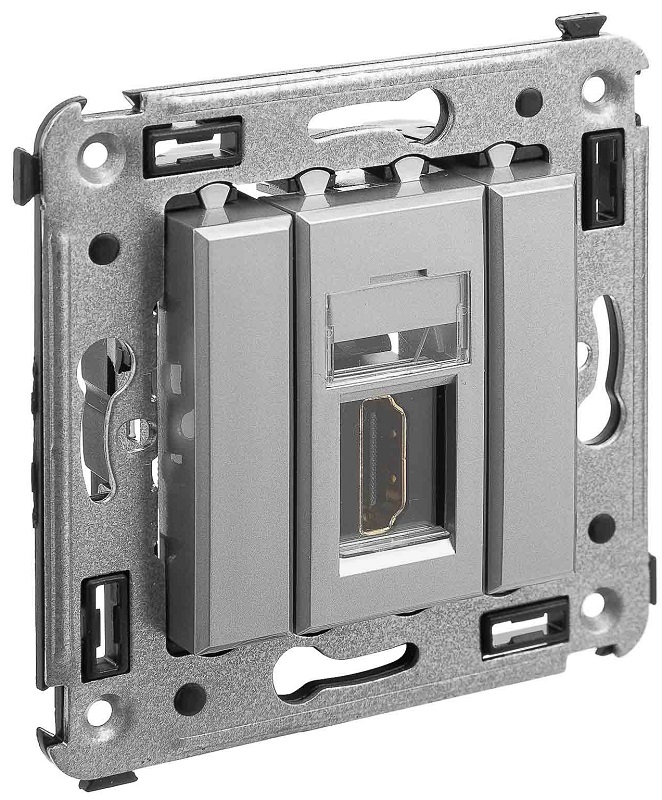 HDMI-розетка. Назначение: для монтажа в подрозеточные коробки глубиной не менее 45 мм (код 59301). Используется в качестве мультимедийной розетки для передачи сигнала (подключение проекторов, мониторов, телевизоров и др.). Характеристики: 1 модуль, с пылезащитной шторкой; с маркировочной табличкой; в комплекте разъем Keystone; для заделки контактов используется инструмент типа 110; тип розетки – "А-А" или "мама-мама"; фиксация в подрозеточные коробки глубиной не менее 45 мм при помощи каркаса с лапками (код 4400802) и саморезов.