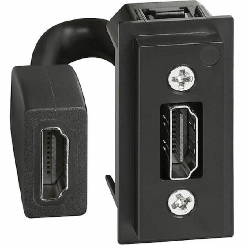 Коллекция серии Living Now от Bticino. HDMI розетка чёрного цвета, с подключённым кабелем со входным разъёмом HDMI для подключения - 1 модуль.