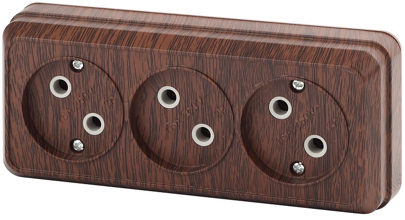 Розетка тройная 3-я серии Intro Quadro открытой установки цвет венге 2-205-10. Номинальные характеристики 16А 250В. Розетка выполнена из термопласта, стали и латуни, оснащёна винтовыми зажимами.