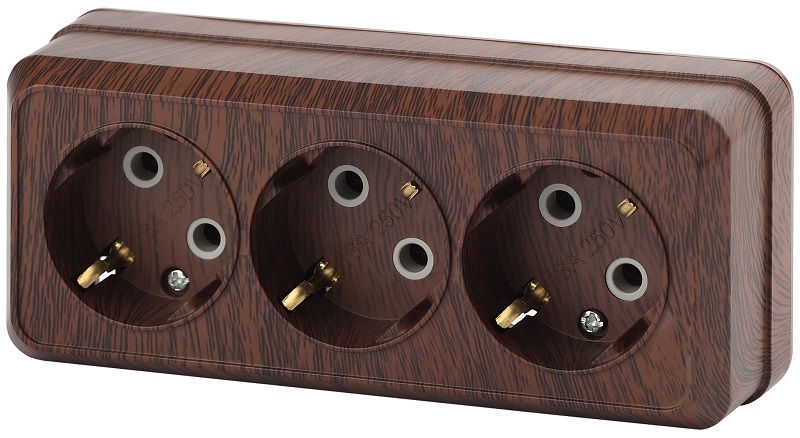 Розетка Intro Quadro 2-206-10 с заземлением трехместная 3х2P+E, 16А-250В, IP20, ОУ, венге Розетка выполнена из термопласта, стали и латуни, оснащёна винтовыми зажимами.