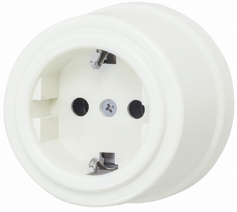 Розетка изготовлена из высокопрочного пластика, устойчивого к истиранию. Применяется с открытой проводкой, хорошо сочетается с витым проводом. При необходимости может использоваться и при монтаже скрытой электропроводки.