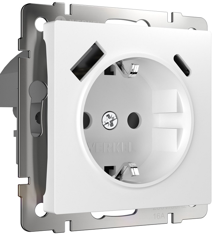 Розетка с заземлением +2хUSB тип A+С без рамки Werkel 1-м. шторки белый глянцевый