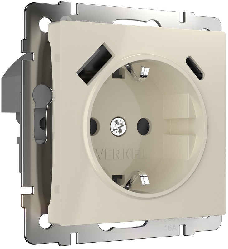 Розетка с заземлением +2хUSB тип A+С без рамки Werkel 1-м. шторки слоновая кость глянцевый картинка