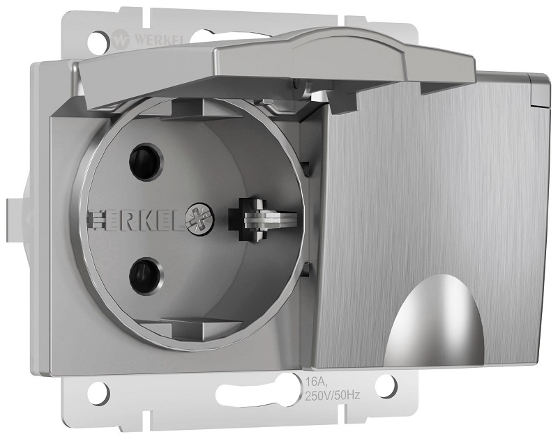 Розетка с заземлением без рамки Werkel 1-м. 2-мод. крышка шторки IP44 серебряный рифленый