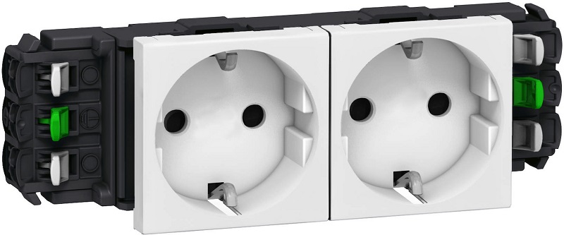 Розетка с защитными шторками двухстороннего подключения для монтажа в кабель-канале DLP с использованием суппортов и рамок для кабель-каналов.