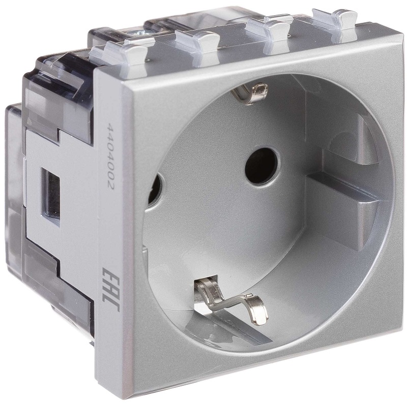 Розетка электрическая с заземлением, со шторками и возможностью установки подсветки, модульная. Предназначена для монтажа в системы "In-liner Front" и "In-liner Aero" при помощи рамок-суппортов и каркасов "Avanti" (код 4400912 и т.д.). Используется для подключения оргтехники, бытовых приборов и т. д. Характеристики: диаметр отверстий для ввода кабелей – 3 мм (по 2 отверстия на одну клемму); винтовые зажимы; защитные шторки; шаблон для зачистки кабеля – 11 мм; номинальный ток – 16 A; номинальное напряжение – 230 В. Изделие устанавливается в подрозеточные коробки глубиной не менее 45 мм при помощи каркаса с лапками (код 4400802) и саморезов. 2 модуля.