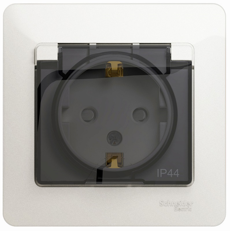 Розетка с заземлением с рамкой Systeme Electric Glossa 1-м. крышка шторки IP44 перламутр