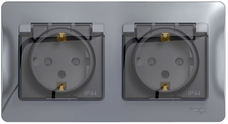 Розетка с заземлением с рамкой Systeme Electric Glossa 2-м. крышка шторки IP44 алюминий