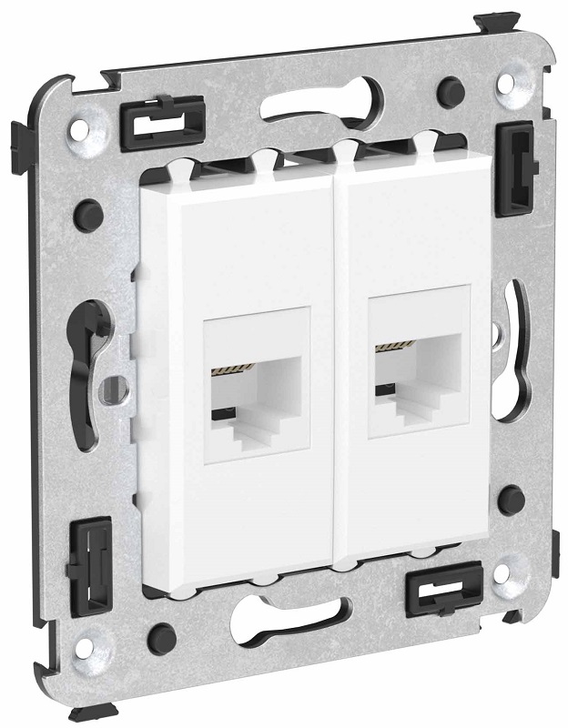 Телефонная розетка RJ-12 двойная без шторки используется для коммутации линий телефонной связи в патч-панелях или для связи телефонных аппаратов с розеткой. Предназначена для скрытого монтажа в стену, поставляется в комплекте с суппортом. Материал – металл, термопласт.