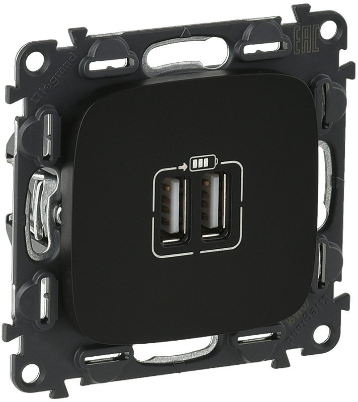 USB-розетка для зарядки и питания различных мобильных устройств. Данная модель имеет два выхода. Соответствует директиве EEC о стандартах зарядки для мобильных устройств и унификации зарядных устройств для мобильных телефонов. Устанавливается в коробку скрытого монтажа глубиной не менее 40 мм.