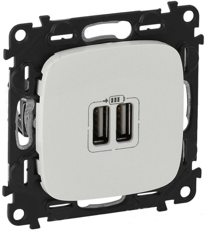 USB-розетка для зарядки и питания различных мобильных устройств. Данная модель имеет два выхода. Соответствует директиве EEC о стандартах зарядки для мобильных устройств и унификации зарядных устройств для мобильных телефонов. Устанавливается в коробку скрытого монтажа глубиной не менее 40 мм.
