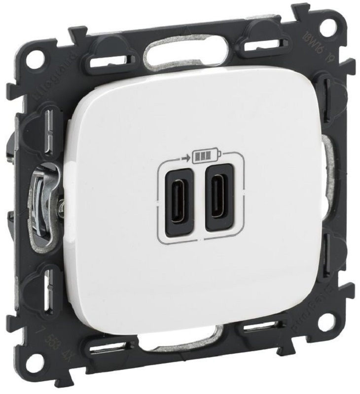 USB-розетка для зарядки и питания различных мобильных устройств. Данная модель имеет два выхода. Включает в себя универсальную модель зарядного устройства с двумя разъёмами типа С. Преимущества USB разъема типа С очевидны: