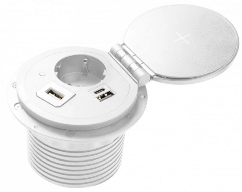 Удлинитель Charger Plus характеризуется очень низким монтажным элементом, т.е. его небольшая высота не будет занимать много пространства под поверхностью столешницы, когда розетка задвинута. Такая особенность позволяет устанавливать удлинитель в различные виды столов, тумб и иной мебели. Выдвижной удлинитель Charger Plus оснащен индуктивным зарядным устройством на внутренней стороне крышки – чтобы зарядить телефон, нужно поднять крышку. Три сменных модуля разъемов делают скрытый удлинитель Charger Plus по-настоящему универсальным устройством, с помощью которого легко организовать работу с несколькими электронными устройствами одновременно.