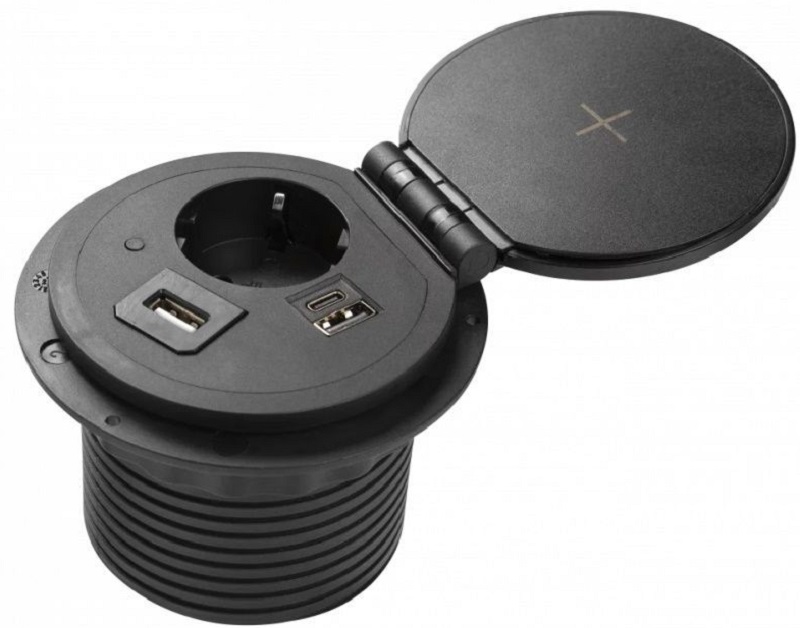 Розетка встраиваемая GTV 1-м.+беспроводная зарядка+2xUSB+HDMI Ø80мм черный