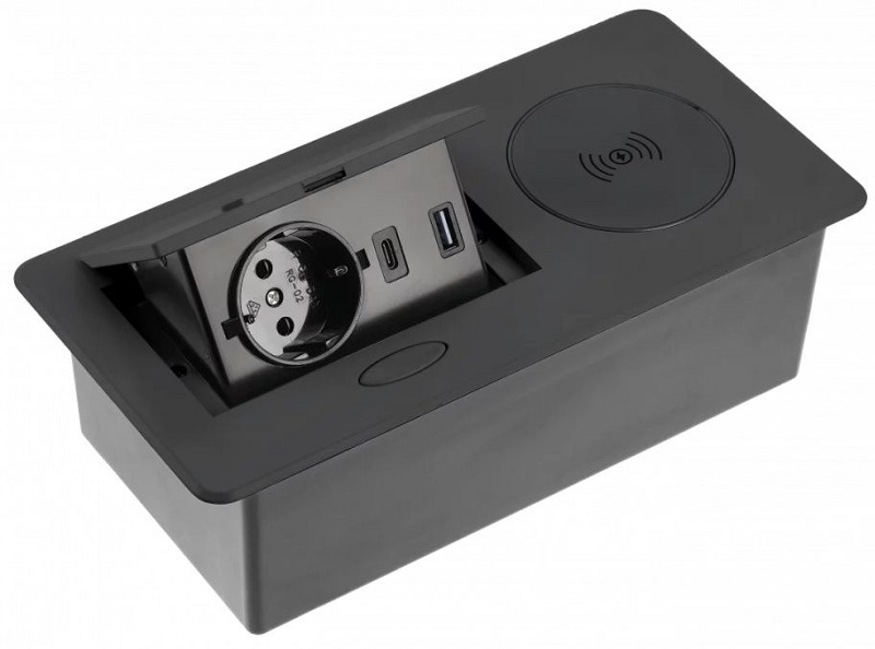 Удлинитель врезной AVARO PLUS 1 розетка AE-PB1SAVAP-20 (Schuko), 2xUSB A+C, индукционная зарядка 5W, черный, с проводом 1,5 метра - идеальное решение для организации пространства! Элегантный удлинитель Avaro Plus – это расширенная версия удлинителя Avaro. Встроенная скрытая розетка Аваро Плюс дополнительно оснащена индуктивным зарядным устройством, что избавляет от необходимости подключать традиционное зарядное устройство для телефона, часов или беспроводных наушников. Скрытый удлинитель AVARO PLUS 1 отлично подходит для длительной работы за письменным столом, особенно если вы часто пользуетесь телефоном и иными гаджетами, требующими периодической зарядки. Такое решение особенно оценят люди, работающие в режиме домашнего офиса.