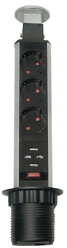 Удлинитель выдвижной 3 розетки (Schucko), 2xUSB, max 3500W, 250V, 2USB max 2,1A с проводом 1,8м с вилкой, серый - ваш надежный помощник на работе и дома, при использовании нескольких электроприборов. Удлинитель устанавливается в столешницу, в предварительно сделанное отверстие соответствующего диаметра, и полностью утапливается в нее, когда не используется. Как только вам нужно подключить какое-либо устройство, вы легким движением извлекаете наружу розеточный блок и подключаете к сети ваш гаджет.