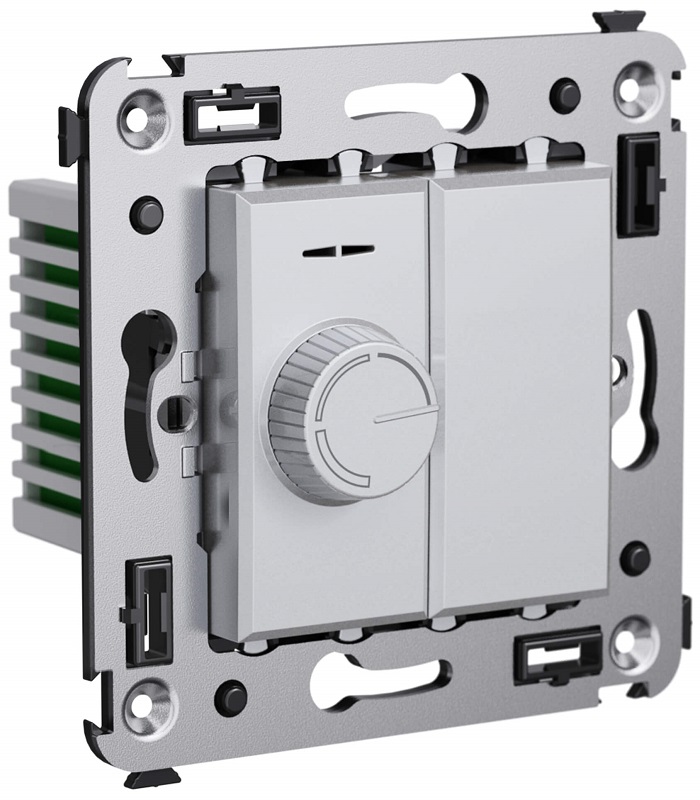 Диммер поворотный для монтажа в стену. Предназначен для монтажа в подрозеточные коробки глубиной не менее 45 мм (код 59301). Используется для управления освещением помещения. Регулирование 60–800 Вт для ламп накаливания и галогенных ламп. Диаметр отверстий для ввода кабелей – 3 мм; винтовые зажимы; шаблон для зачистки кабеля – 11 мм; встроенная подсветка. 2 модуля.