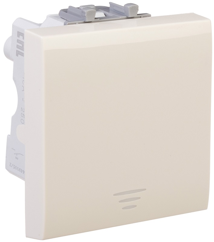 Выключатель одноклавишный однополюсный, модульный. Предназначен для монтажа в системы "In-liner Front" и "In-liner Aero" при помощи рамок-суппортов и каркасов "Avanti" (код 4400912 и т.д.). Используется для включения/выключения освещения. Характеристики: диаметр отверстий для ввода кабелей – 3 мм (по 2 отверстия на одну клемму); винтовые зажимы; шаблон для зачистки кабеля – 11 мм; номинальный ток – 16 A; номинальное напряжение – 230 В. Возможна фиксация в подрозеточные коробки при помощи каркаса с лапками (код 4400802) и саморезов. 2 модуля