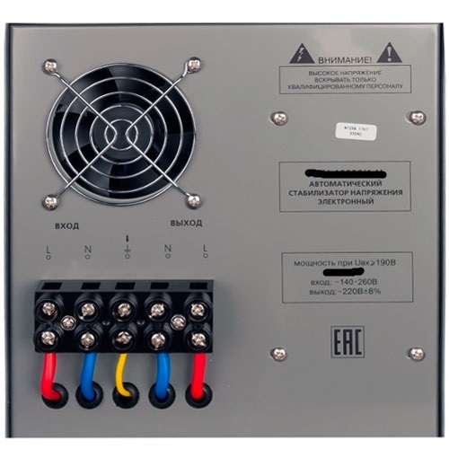 Стабилизатор напряжения Ресанта ACH-10 000/1-Ц имеет мощность 10 кВт, данной мощности хватает, чтобы питать отдельные потребители, или несколько потребителей, небольшие объекты в целом, но суммарное потребление не должно превышать установленный мощностной номинал. Диапазон входных напряжений стабилизатора 140-260 Вольт, но при понижении входного напряжения ниже 190 Вольт начинается потеря выходной мощности, при минимальном входном напряжении 140 Вольт выходная мощность сократиться на 50% и составит 5 кВт. При длительных превышениях допустимых значений входного напряжения система защиты отключит выходное напряжение, а сам стабилизатор уйдет в режим защиты. При перегреве стабилизатора так же произойдёт аварийное отключение выходного напряжения. Максимальное температурное значение обмотки трансформатора может достигать 70 °С, нагрев трансформатора напрямую зависит от температуры окружающей среды. Стабилизатор так же защищён от короткого замыкания при помощи предохранителя.