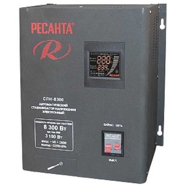 Стабилизатор напряжения Ресанта CПH-8300 имеет мощность 8,3 кВт, данной мощности хватает, чтобы питать отдельные потребители, или несколько потребителей, небольшие объекты в целом, но суммарное потребление не должно превышать установленный мощностной номинал. Диапазон входных напряжений стабилизатора 90-260 Вольт, но при понижении входного напряжения ниже 190 Вольт начинается потеря выходной мощности, при минимальном входном напряжении 90 Вольт выходная мощность сократиться и составит 3,1 кВт. При длительных превышениях допустимых значений входного напряжения система защиты отключит выходное напряжение, а сам стабилизатор уйдет в режим защиты. При перегреве стабилизатора так же произойдёт аварийное отключение выходного напряжения. Максимальное температурное значение обмотки трансформатора может достигать 70 °С, нагрев трансформатора напрямую зависит от температуры окружающей среды. Стабилизатор так же защищён от короткого замыкания при помощи предохранителя.
