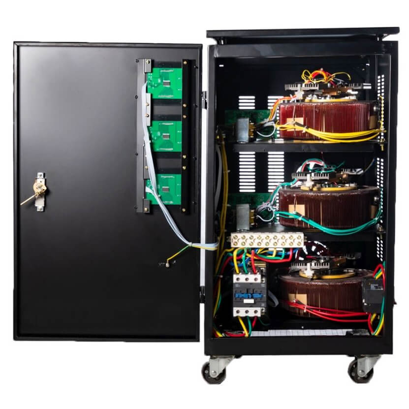 Данный стабилизатор обеспечивает самую точную регулировку напряжения (погрешность до 2%) за счет считывания напряжения с каждого витка катушки. Номинальная мощность при входящем напряжении 190В составляет 30000Вт. Количество фаз = 3. Размещение напольное, есть