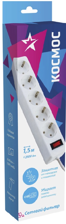 Удлинитель с сет. фильтром Космос 5х1.8м с заземл. 10А 2200Вт индикат. сети белый