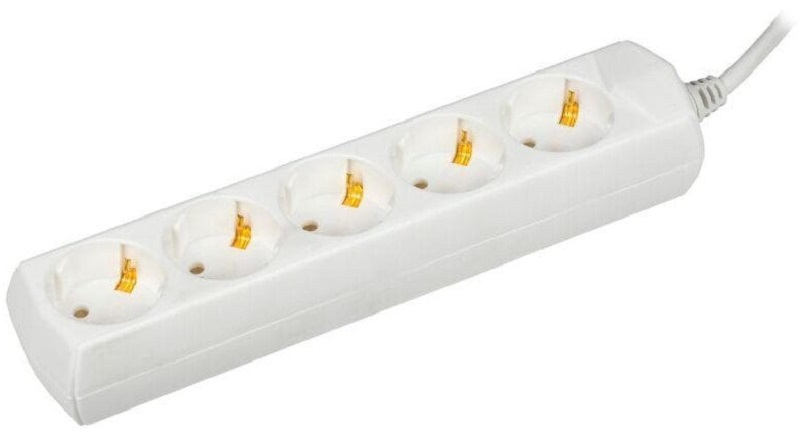 Удлинитель с заземлением; провод 3x1мм2, 100% медь, корпус - полипропилен с антипиренами (негорючий), контактные группы - латунь, максимальная нагрузка - 16A/2200Вт