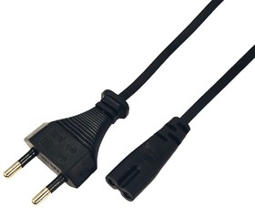 Шнур сетевой 1.8М 2x0.5мм² REXANT предназначен для подключения к сети переменного тока (AC) с напряжением 220B аудио-, видеоаппаратуры, источников питания ноутбуков, игровых консолей и других приборов, имеющих штыревой сетевой разъем типа С8 (известен из-за его формы как "восьмёрка"). Данный сетевой шнур (IEC cord) оснащен с одной стороны литой неразборной плоской вилкой (Евро), с другой литым гнездовым неполяризованным разъёмом типа C7 (евро-разъём) и двухжильным проводом с сечением жил 0.5мм². Основные характеристики: